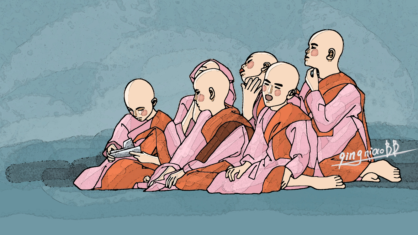 因为都剃着光头,一眼难以分辨是男是女,但常识告诉我,着粉色僧服的是尼姑。