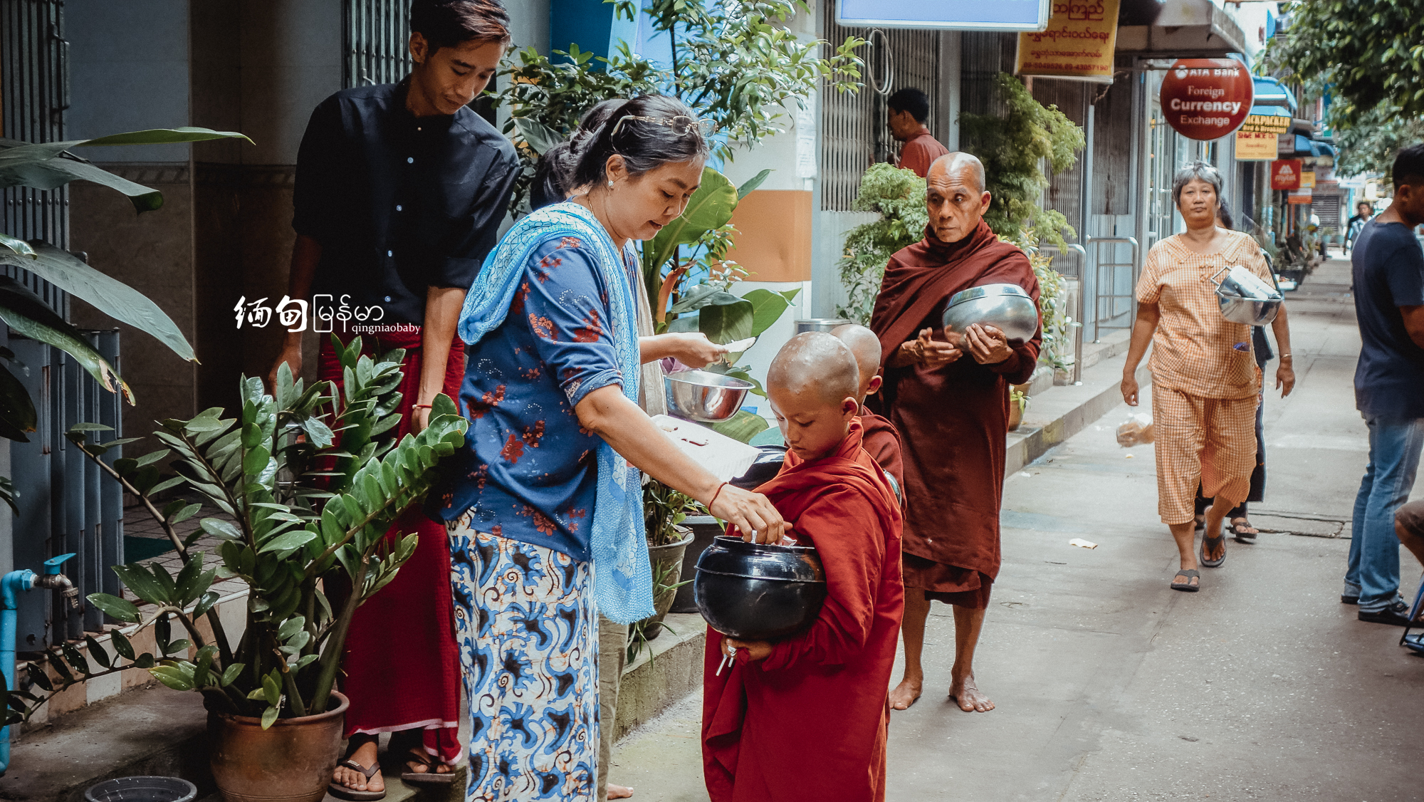 仰光▲清晨我被化缘的声音吵醒,急急忙忙跑下楼来看。这里是 仰光 老城区的 印度 街,青旅楼下鱼龙混杂,各族人民欢聚一起。佛教传入 缅甸 已经有两千五百多年的历史,这里的人全民信教。僧侣的着装是绛红色,尼姑是粉红色,小沙弥则是纯白色。和尚在 缅甸 的社会地位非常高,几乎所有家里有男丁的人都希望男孩子能出家一次,日后可以自愿还俗,也可以继续侍奉佛祖。