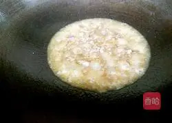 6.锅里放少许油七成热,放入肉末炒散,在放盐味精生抽,最后再放蒜醋水并关火,盛出!
